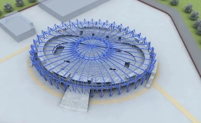 自行车馆屋盖采用轮辐式悬索结构体系屋盖,结构外圈投影面为一个椭圆,内圈投影面为一个正圆。