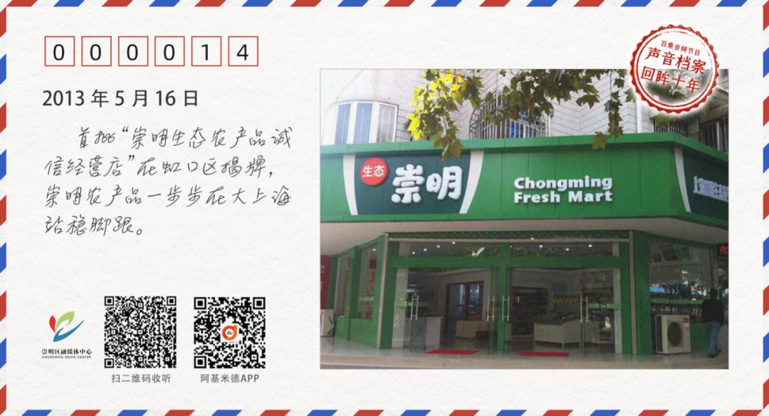 2013年5月16日,由上海市崇明绿色食品产销联合会举行的首批“崇明生态农产品诚信经营店”揭牌仪式在虹口区场中路崇明生态农产品专卖店举行。