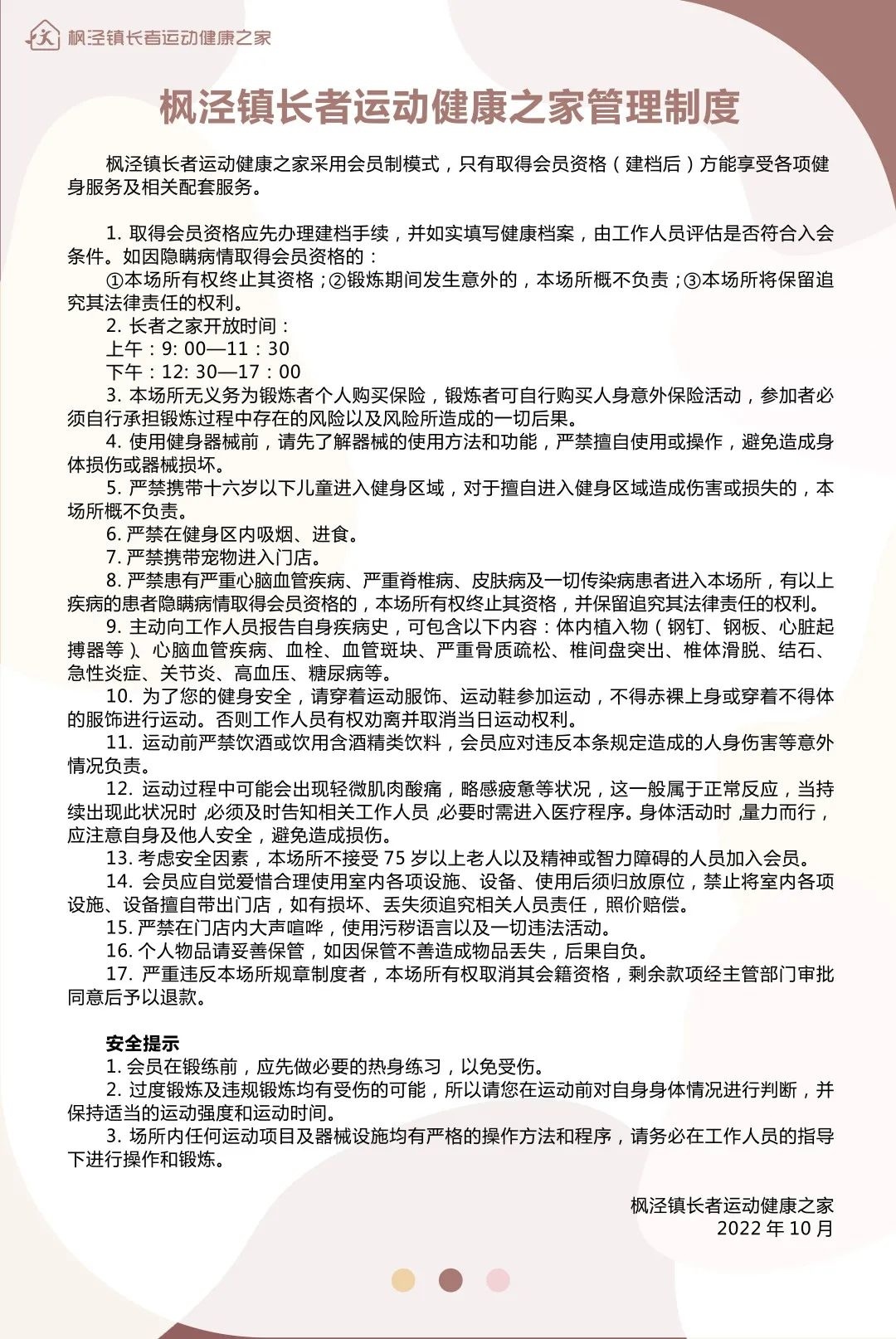 枫泾镇长者运动健康之家管理制度