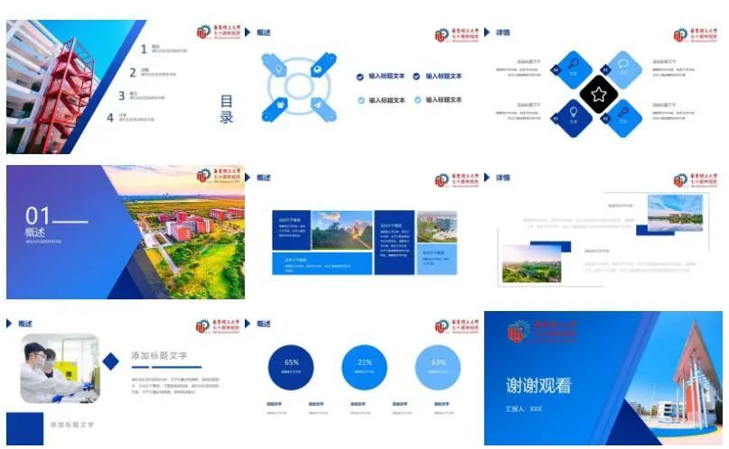 除了好吃的雪糕,学生设计师还考虑到日常实用性,贴合校庆主题精心设计了六款PPT模板。除了最喜庆的红色主题,也配合学术需求,以简介明快的蓝色、紫色等不同色调,制作了可以满足辩论、汇报、学习等不同场合使用的“专属模板”。