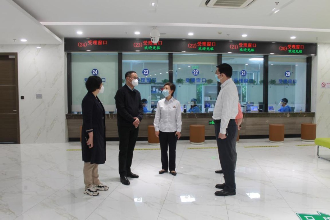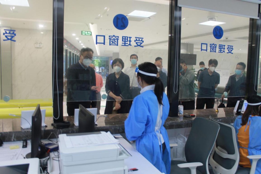 ▲5月28日,市房管局局长王桢一行来到金山区房地产交易中心,现场听取中心疫情防控措施落实和复工情况介绍,亲切慰问一线窗口工作人员
