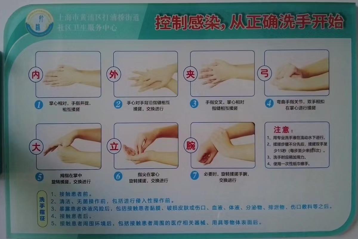 目前比较流行的洗手“七步法”,即“内、外、夹、弓、大、立、腕”,每步不分先后,揉搓双手至少15秒,使用一次性纸擦手。内,就是双手掌心相对揉搓;外,就是手心对手背揉搓;夹,就是十指交叉揉搓;弓,主要是洗手指关节,相互揉搓;大,就是洗大拇指;立,就是把五指指尖立起来;腕,就是洗手腕。