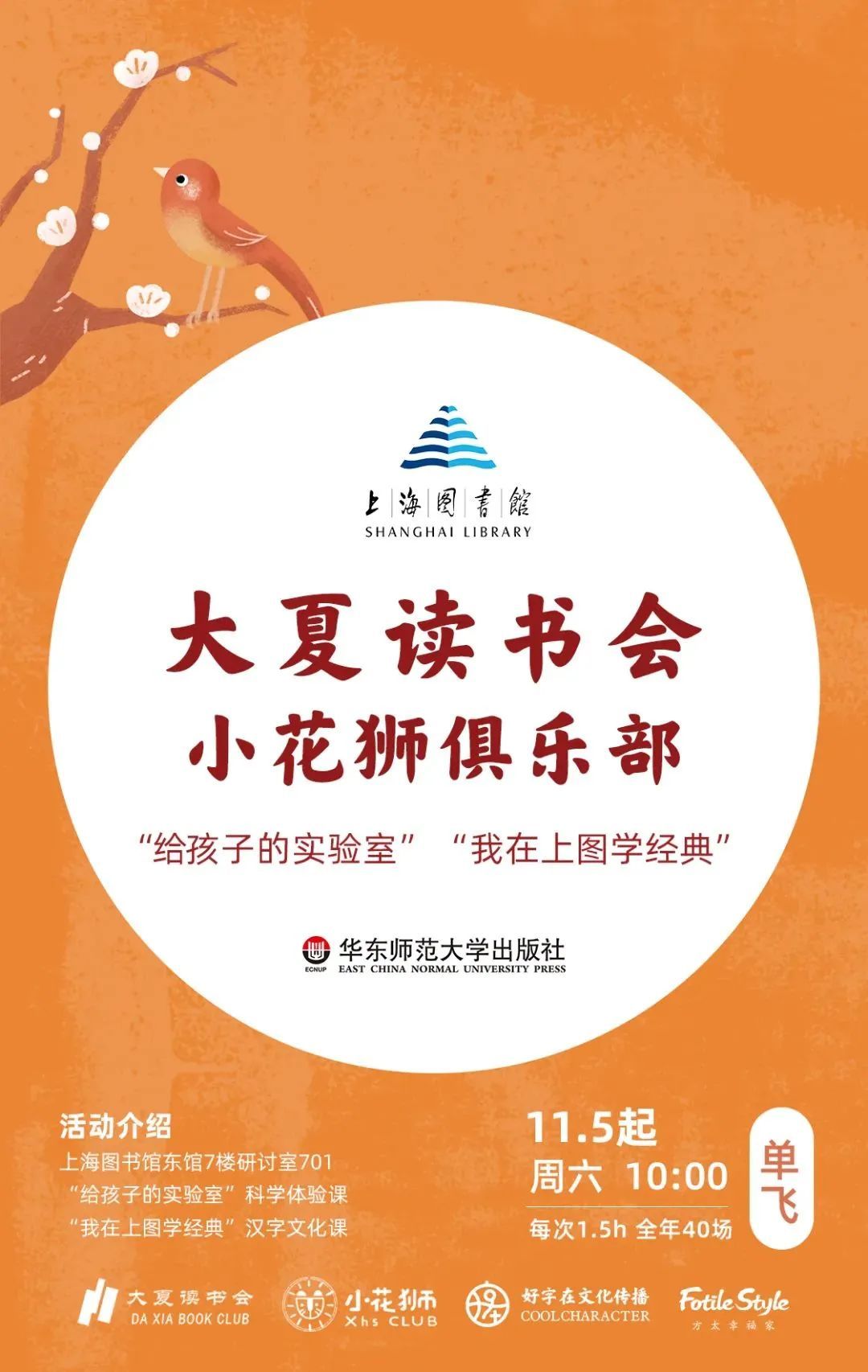随着上海图书馆东馆的正式开放,由上海图书馆、华东师范大学出版社、好字在和方太幸福家联合打造的“大夏读书会·小花狮俱乐部”周末活动在本月正式启动啦!