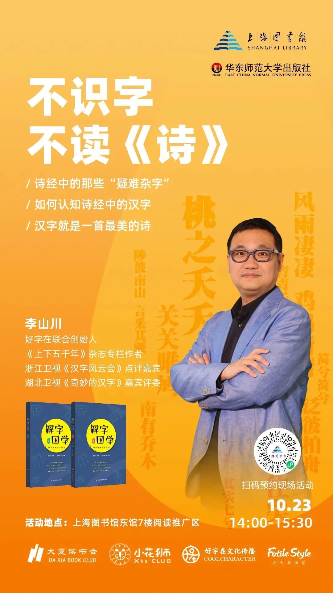 10月23日,“大夏读书会·小花狮俱乐部”举办首场公益讲座活动,本次活动我们特别邀请好字在“汉字思维”课程体系创立者李山川老师做客上海图书馆东馆,为读者们解读中国最早的诗歌总集——《诗经》。