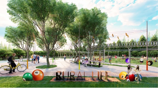以场地内现有果园为基础,注入烟火气息,打造百草园、亲子乐园、果园采摘等业态,形成具有蓬勃活力的生活花园,为市民提供果园和多功能节庆活动场地。