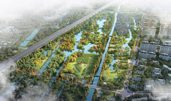 一条贯穿南北长度约1公里的绿道系统穿梭于特色百米林带之中,串联丰富的水绿空间,并结合唐镇“九球”文化打造连续的“九彩花带”林中绿廊,绽放活力动感的序列空间。