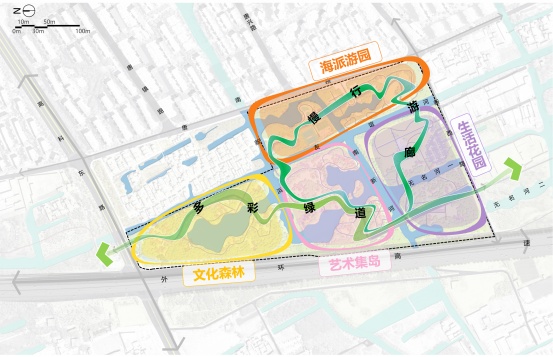 公园依托现状,对环境进行提升优化,整合现有水网、密林、生态资源,抓住“海派文化”内核,打造特色森林艺术嘉年华,让市民体验集交流、运动、文艺为一体的新时代海派生活风尚公园。