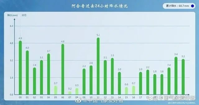 例如新疆克孜勒苏柯尔克孜自治州,在今年5月下旬出现了历史罕见的凶猛暴雨,5月29日-5月30日阿合奇气象观测站24小时降水量达58.8毫米,为暴雨级别,创本站有气象记录以来日降水最大纪录。同时,监测数据也显示,阿合奇的这场暴雨一刻不停连下了超过40个小时,本站累计降水量超过100毫米,附近自动站更是超过140毫米。