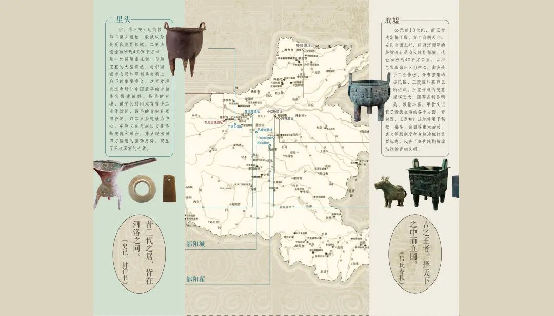 河南省境内主要夏商周遗址分布图,展厅地图及重点文物分布位置,夏、商、周三个朝代的概况、都城简介、重点文物图片及介绍……展览重点信息一网打尽!感受三代文化的沧桑巨变,更有隐藏彩蛋等您来发现~