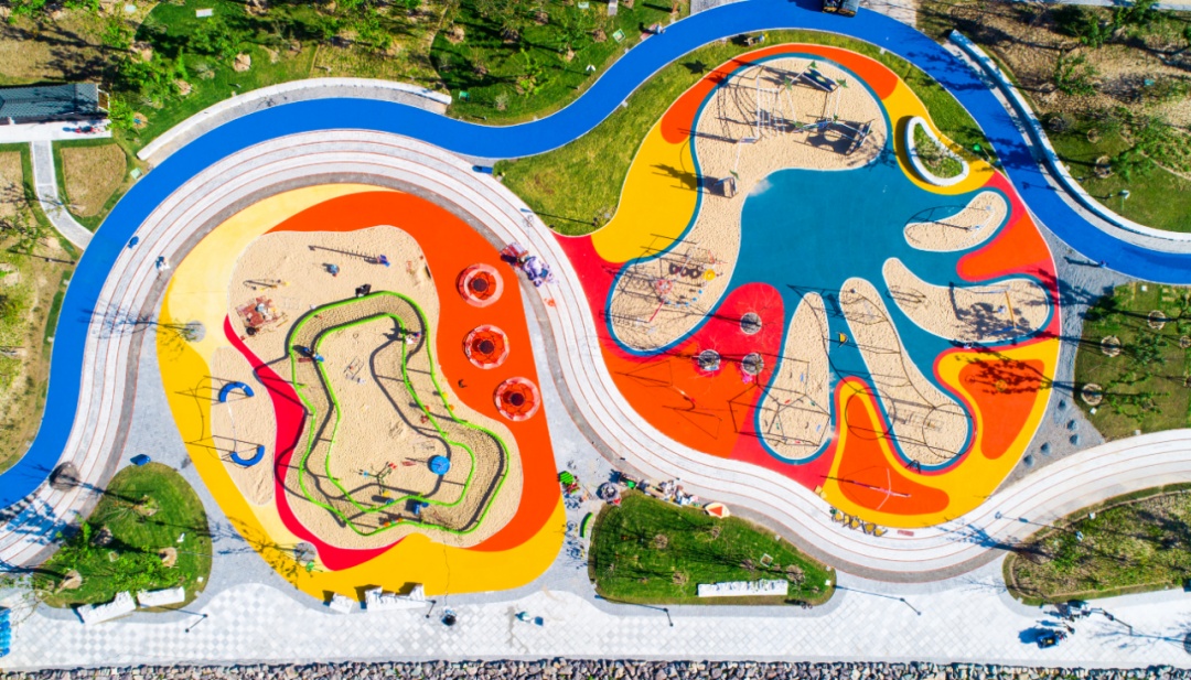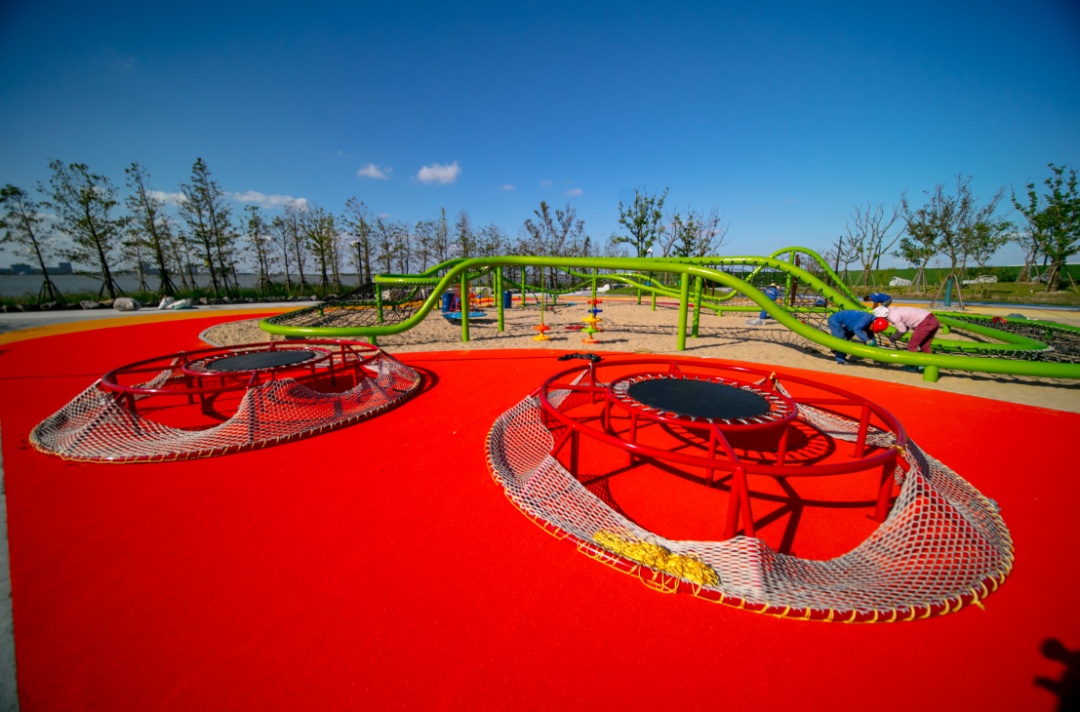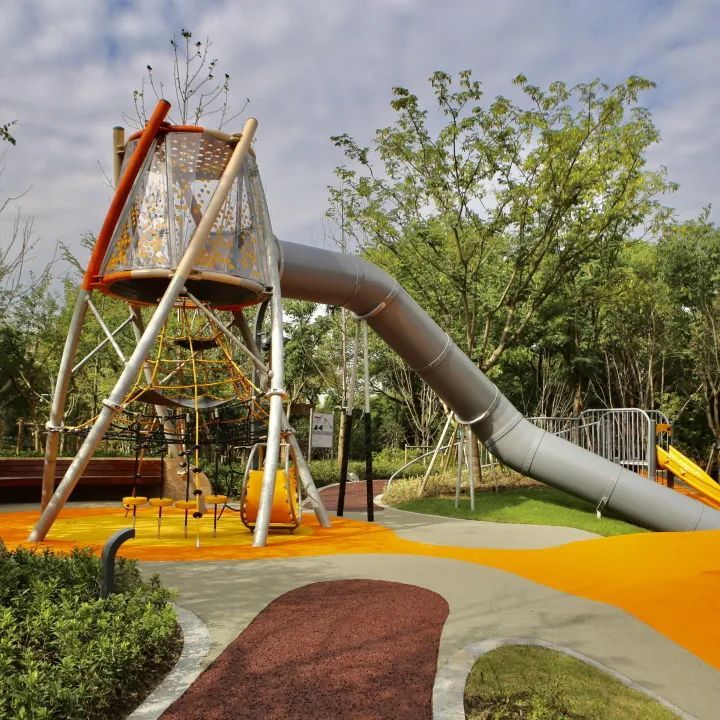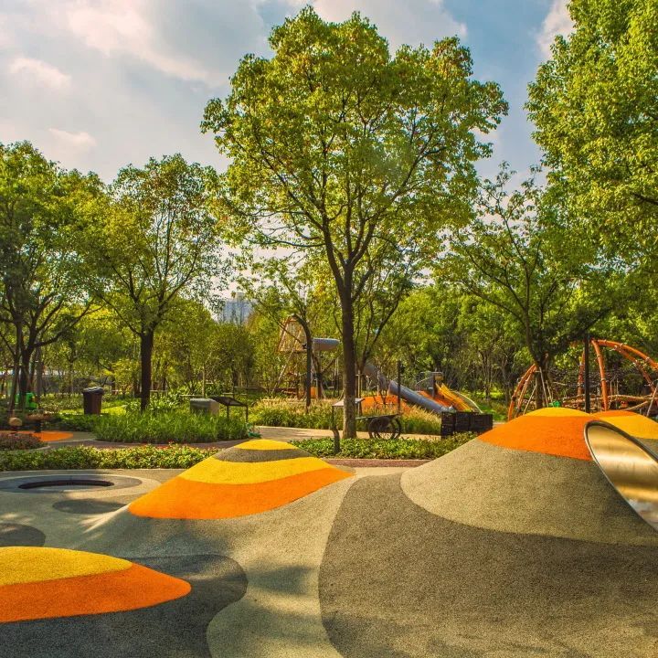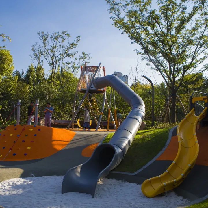 悦动公园离浦东足球场很近,颜值十分高。儿童乐园区域主要由地形滑梯连接起高低两块区域。除了滑滑梯之外,还有各种秋千、组合攀爬架、跷跷板、健身器材,带娃可以玩上一整天。