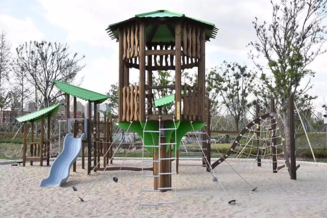 公园里的无动力游乐设施,贴心地分成了大童和小童区域,有长滑梯,旋风塔攀爬架,冒险者穹顶网,攀岩,跷跷板,挖沙,荡秋千和蹦床等。