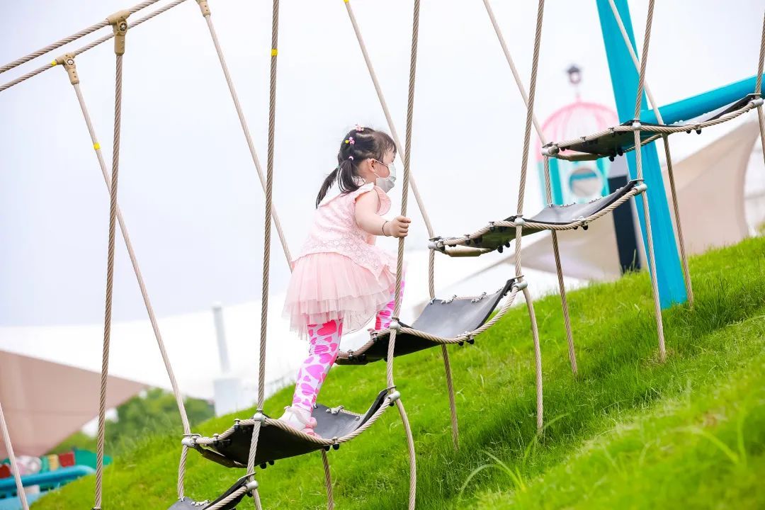 兔宝王国里有秋千蹦床、益智面板、各式攀爬架……是小萌宝们的天堂。颜色绚丽的兔子摆出“拔萝卜”的姿势,孩子们可以从“萝卜坑”爬出。成长世界里的项目更具挑战性,有各种绳索、吊桥,孩子们可以选择不同的入口进入城堡,到达城堡中心的高塔,享受登顶的乐趣。