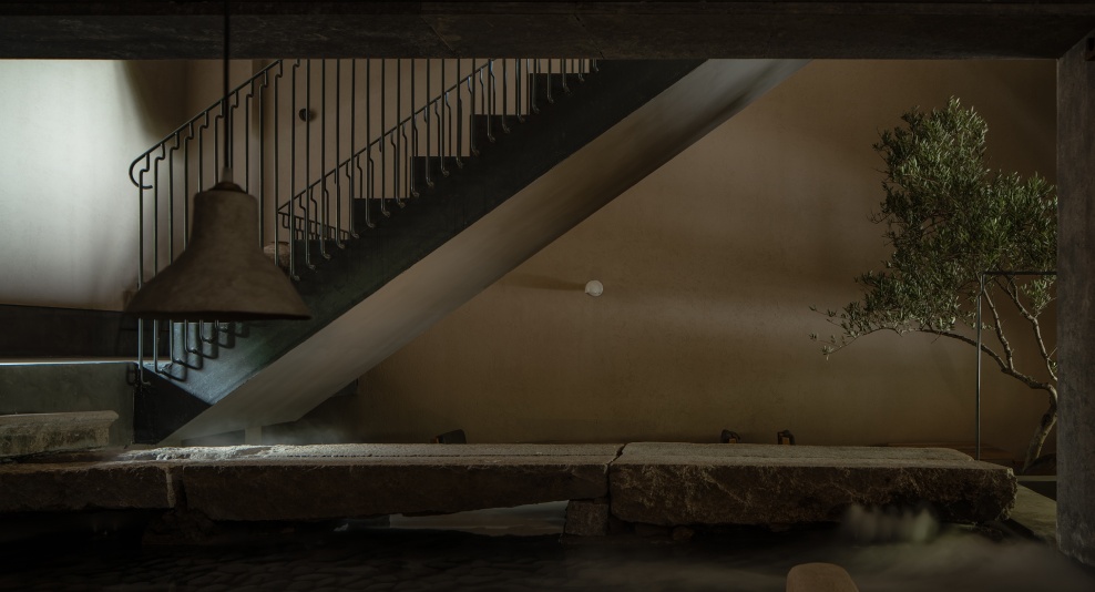 记者在现场看到,小楼外立面较为低调,传统木檐很古朴,简约黑色的可移动拉门、外围绿植与室内座椅相辅相成。走进一楼空间,光影偏暗,但当太阳露出云层时,洒进来的光线则能将空间“点亮”,明暗交错。往深处走进,是一处由水、树、石等组成的室内造景,还原真实自然山林中的“溪边长树”,形成了一幅小桥流水的景象。