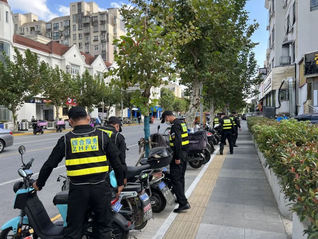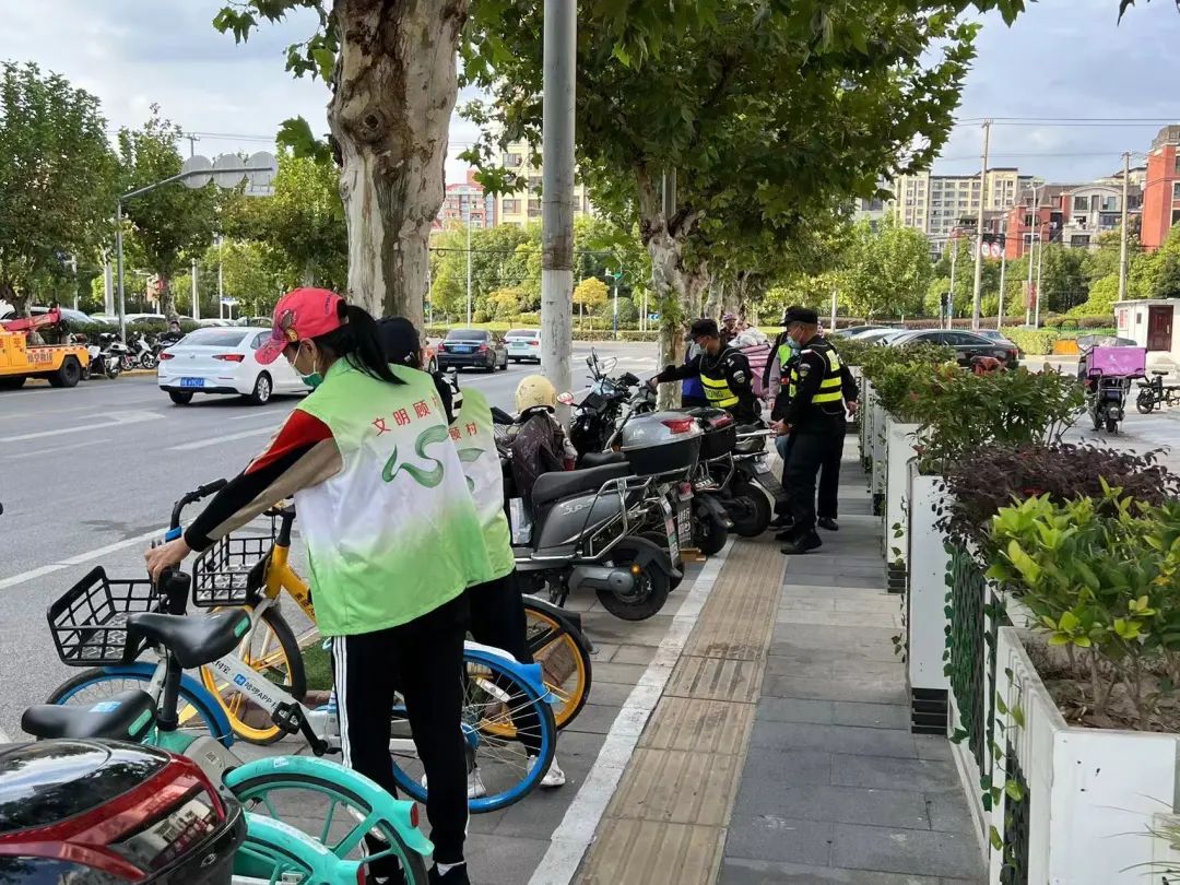 镇交警五大队在车流、人流量较大路口严查电动自行车未悬挂牌照(无牌无证)、骑乘人未佩戴安全头盔、逆向行驶等违法行为。镇市容办对乱停放的非机动车进行整治,将共享单车、外卖电瓶车等停放整齐。志愿者在教育路等路口引导居民过马路、提醒过往行人注意遵守交通规则。