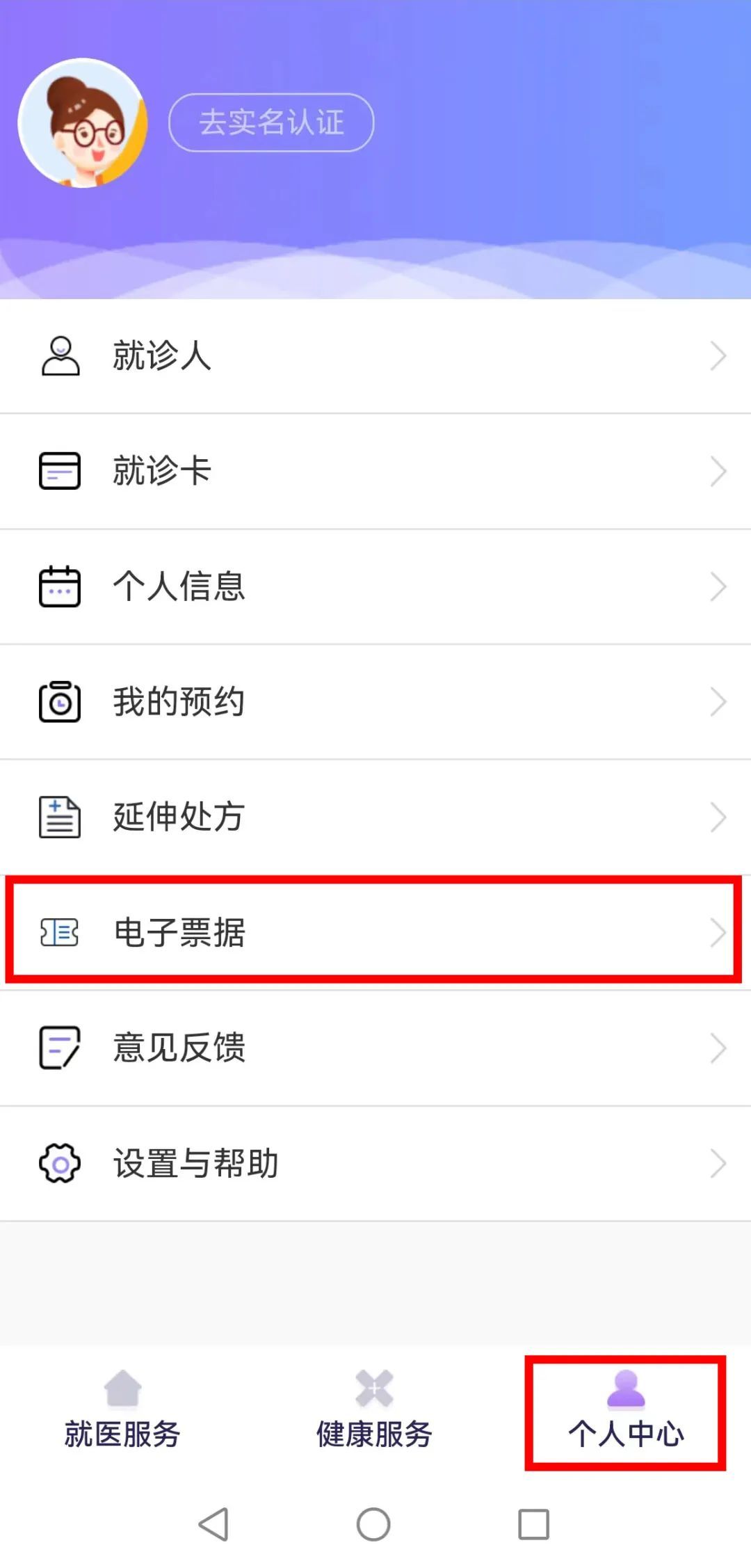 【就医服务】-【个人中心】-【电子票据】
