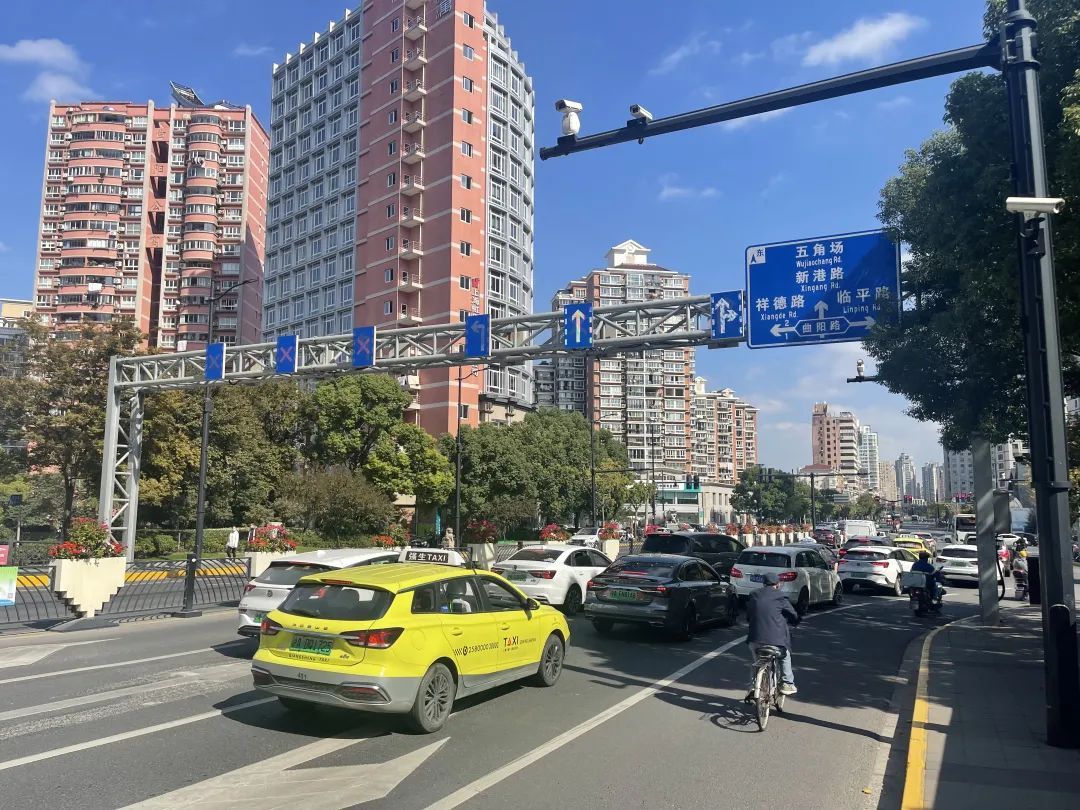 此外,虹口交警重新规划四平路近曲阳路南向北路段机动车道,将原本第二车道的左转车道变为直行车道,车道上方指示标牌也做相应改变;措施实施后,大大提升直行车辆的通过率,同时也能提升左转车辆的通过率和待行车蓄车量,消除拥堵节点。