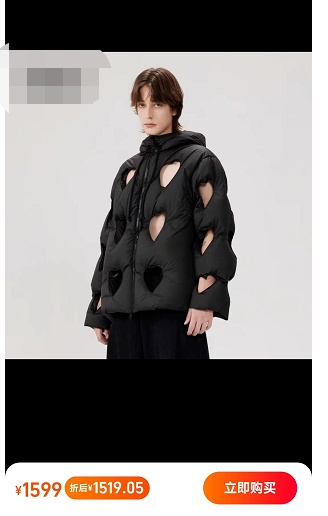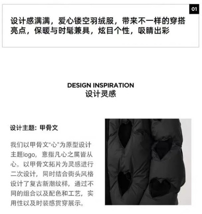 该售卖商家透露,镂空羽绒服的设计主题为甲骨文,以甲骨文“心”为原型设计主题logo,意指凡心之属皆从心。以甲骨文拓片为灵感进行二次设计,同时结合街头风格设计了复古新潮纹样,通过不同的组合以及配色和工艺,实用性以及时装贯穿展示。