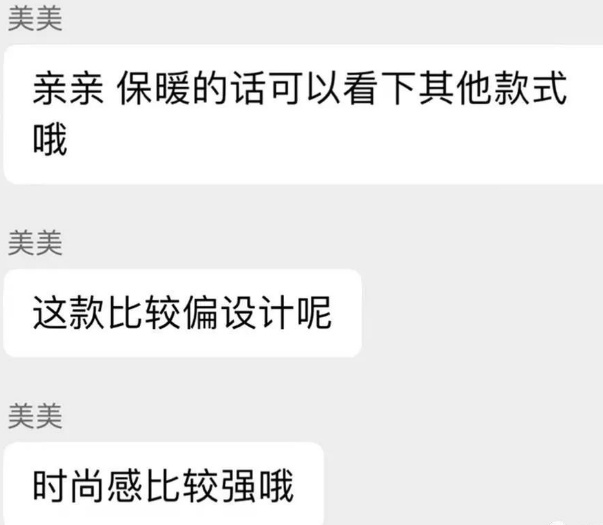 客服还表示,此款羽绒服穿上确实会透风,“这款羽绒服主打的是设计,时尚感比较强,如果追求保暖效果的话建议选择其他款式。”