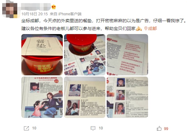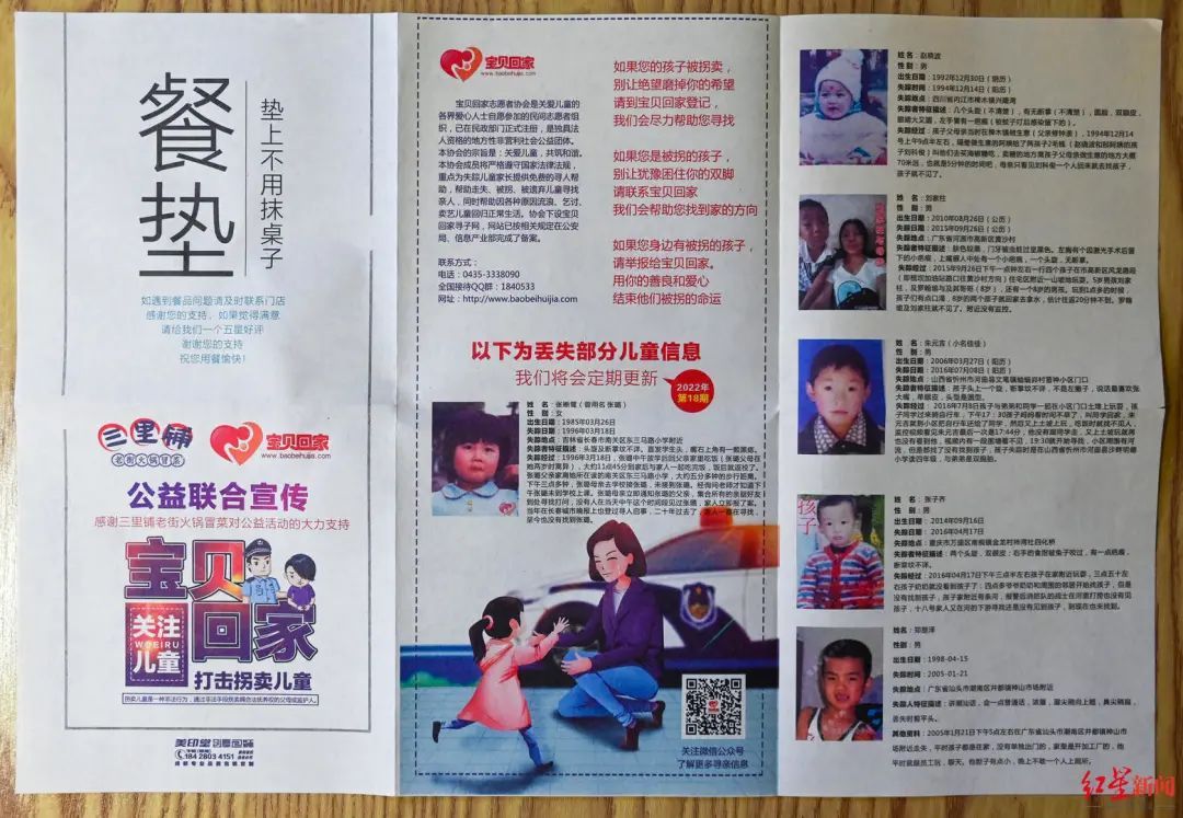 “在成都,卖得最好的店,一年会卖出十二三万单外卖,那就是十二三万份。”张建平说。但稍显遗憾的是,目前,还没能通过餐垫信息,成功找到走失儿童。“我们一直期待,能够有一次真正的帮助到这些寻亲家庭的案例。”张建平说,近几年,随着国家加强了对拐卖妇女儿童违法行为的打击力度,也建立了不少官方的打拐平台,民间志愿者的自发活动相应减少了一些。