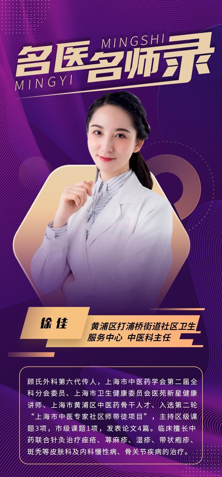 徐佳,黄浦区打浦桥街道社区卫生服务中心,中医科主任,顾氏外科第六代传人。临床擅长中药联合针灸治疗痤疮、荨麻疹、湿疹、带状疱疹、斑秃等皮肤科及内科慢性病、骨关节疾病的治疗。