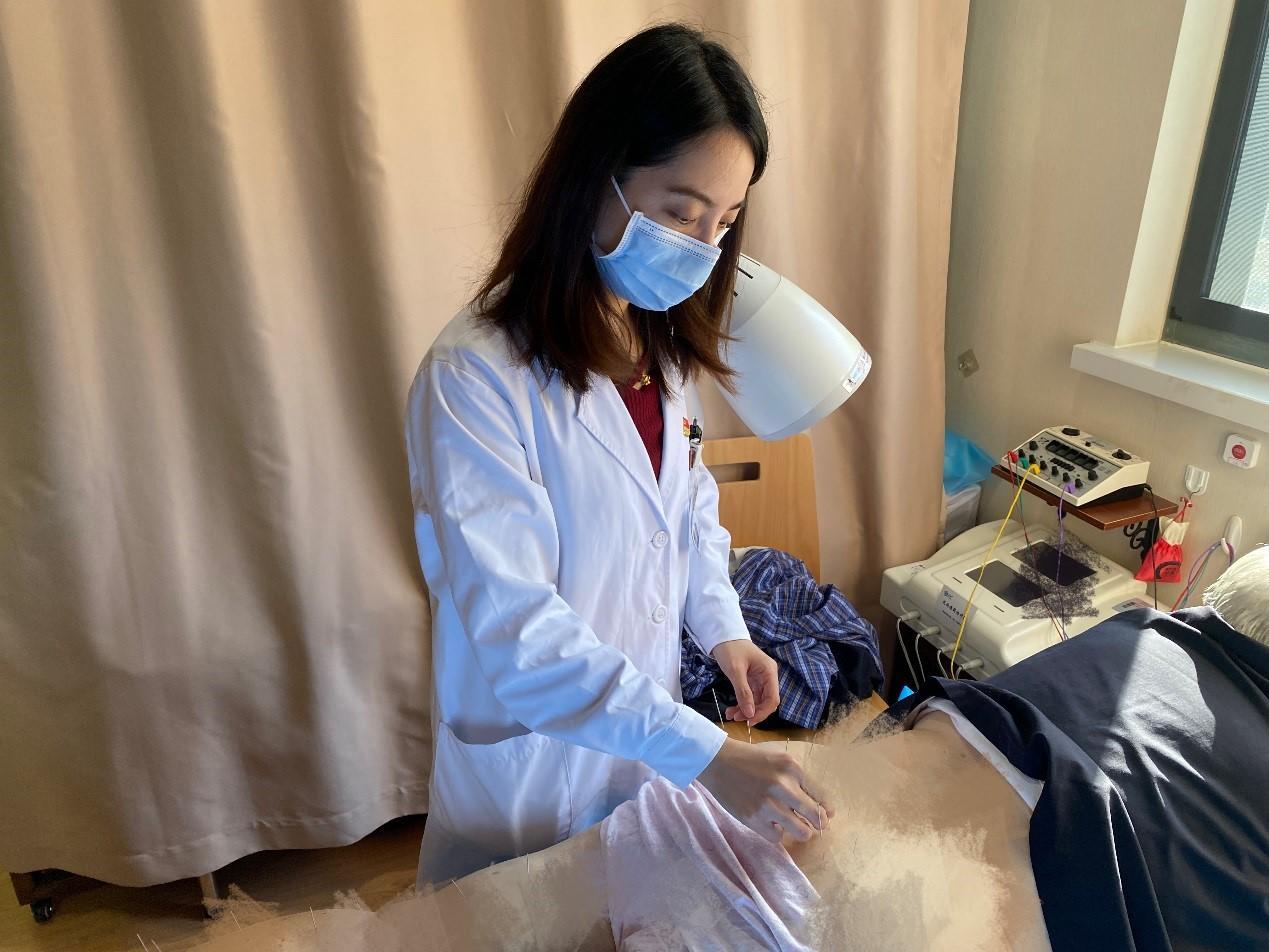 在位于丽园路712号的打浦桥社区卫生服务中心三楼的中医科室内,中医科医生徐佳正在运用针灸为一名患者进行荨麻疹治疗。