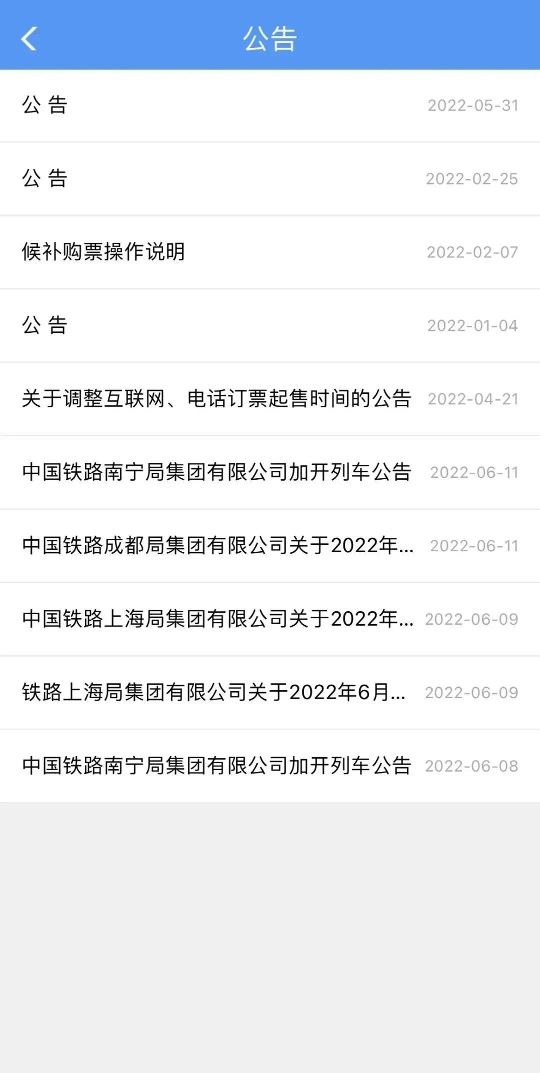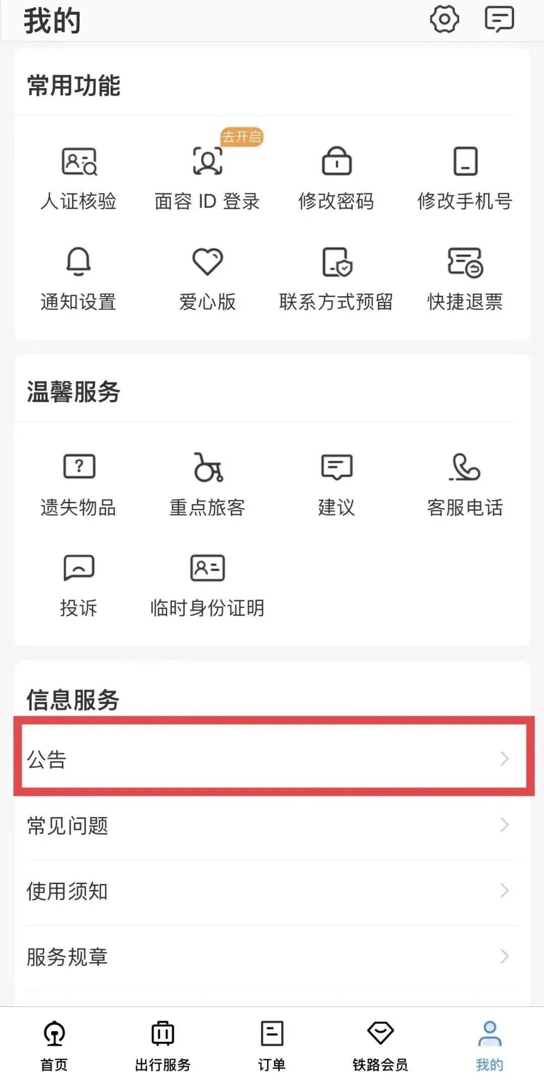 可以在铁路12306APP“我的”-“信息服务”-“公告”中查看,会显示最近公告,如下图。