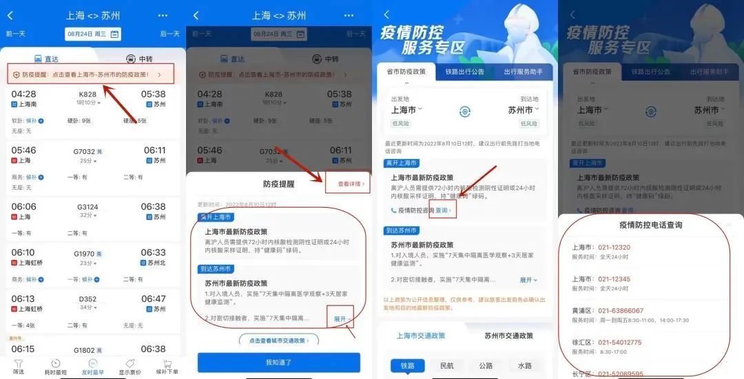 打开铁路12306APP,首页输入发、到站后查询车次,上方出现“防疫提醒”,可点击查看。如需了解更多可点击右上角“查看详情”,内含疫情防控咨询电话可供查询。