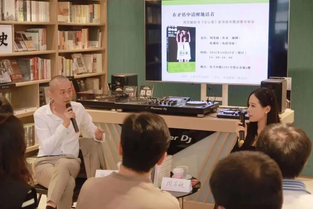 在幸福集荟·黑石店,周苏婕与合作多次的导演张训玮一起开了第一场新书读者见面会。这部小说集中的两部作品《溏心爸爸》《一个女人的死亡之谜》被改编为话剧《溏心爸爸》,曾在2021年上海·静安现代戏剧谷上演。同时,电影剧本由周苏婕、张训玮合作完成,预计明年筹备拍摄;小说集中另一篇作品《盲人摸象》则被改编为短片,下月与观众见面,这些都显示出新一代写作者的跨界能力。