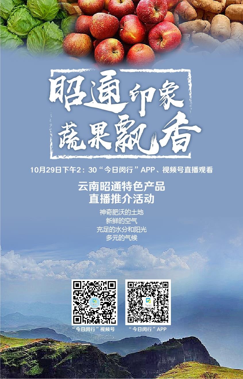 10月29日下午2:30,闵行区融媒体主持人海文、刘帆将分别在云南昭通“苹果种植基地”和“高原冷凉蔬菜种植基地”,为大家带来特色农产品推介,届时大家可以在“今日闵行”APP上观看直播。