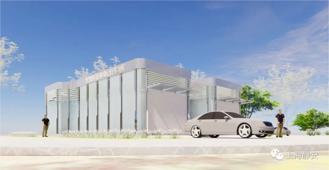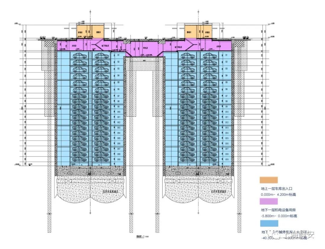 地上一层构筑物为智慧车库出入口及管理设施,占地面积286平方米;地下一层为设备层;地下一层以下为地下停车设备层,采用19层钢结构设计,利用PCS型垂直升降立体机械停车,运用托盘式停车搬运技术和手机APP预约、AGV自动存取车搬运设备,单车平均存取车时间90秒,是集设备、操作、监控、维保、管理智能化于一体的现代化智慧车库。