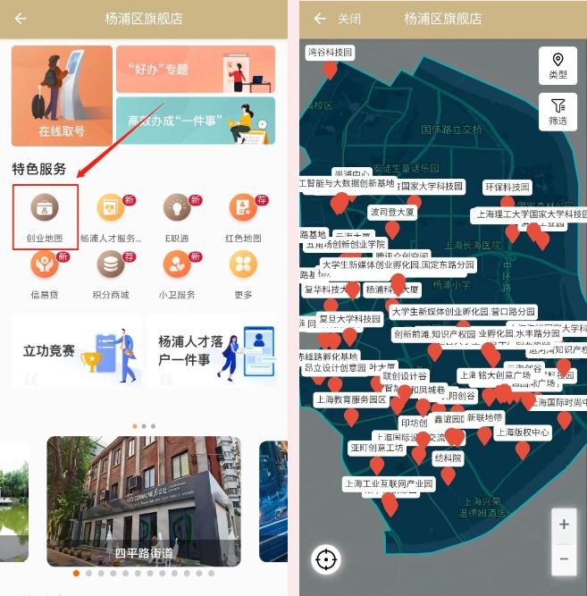 打开手机,手指点一点,产业布局、待租面积、租金信息、地理位置、商圈覆盖、周边配套设施等信息一应俱全,创业者能直观便捷地搜索到适合自身入驻的创业园区,省时省力。这个“搜索利器”就是杨浦区便民服务电子地图(杨浦创业地图),于2020年上线,整合了辖区各创业园区、办公楼宇及周边的便民服务点信息,为创业者提供“按图索骥”的便利。