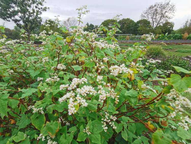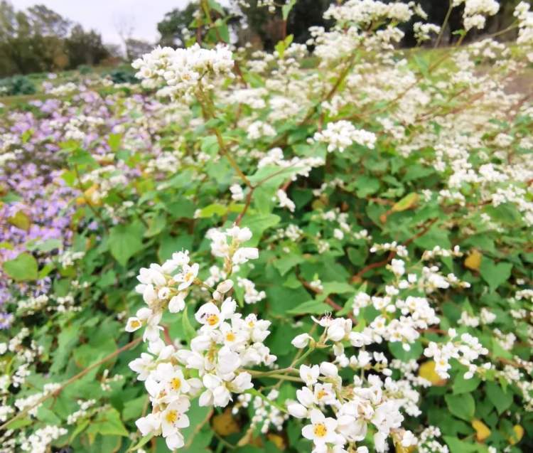 初秋,正是荞麦花开的季节,种在城市菜园的国家二级保护植物金荞麦,绽放着一簇簇纯白动人的小花,星星点点地点缀于青葱翠绿的叶片间,随风摇曳,美不胜收。