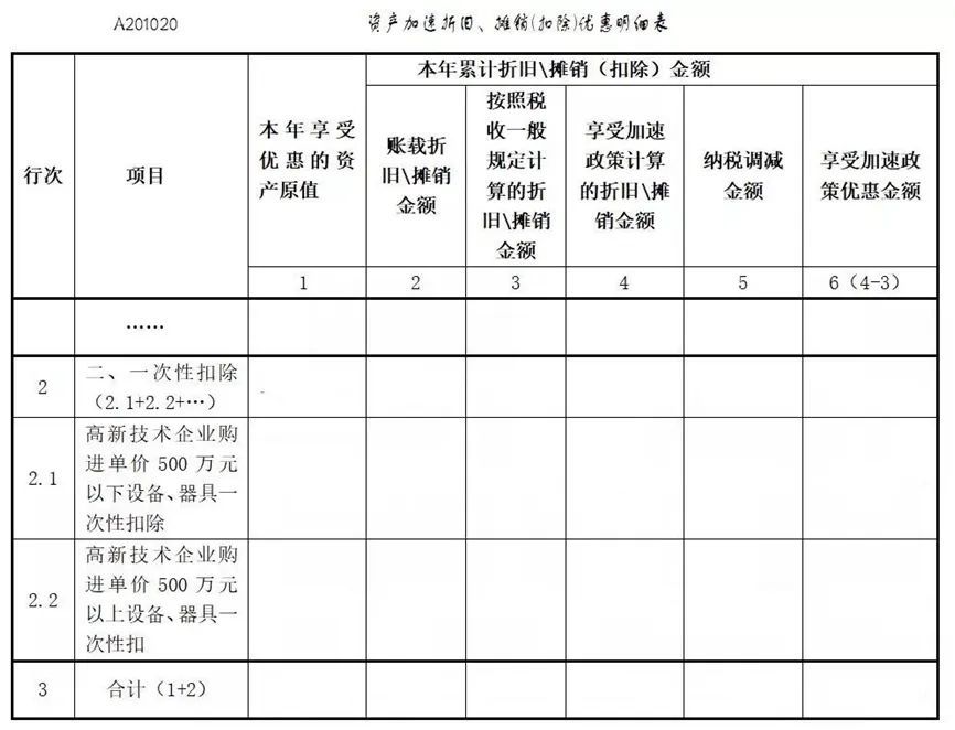 第一步,先填报一次性扣除情况。对于单价500万元以下设备、器具,在《资产加速折旧、摊销(扣除)优惠明细表》(A201020)第2行“二、一次性扣除”下的明细行次中填写“高新技术企业购进单价500万元以下设备、器具一次性扣除”事项及“本年享受优惠的资产原值”等信息;对于单价500万元以上设备、器具,填写“高新技术企业购进单价500万元以上设备、器具一次性扣除”事项及“本年享受优惠的资产原值”等信息。填写完毕后,将该表单中“纳税调减金额”列次的合计值(第3行第5列)填写在《中华人民共和国企业所得税月(季)度预缴纳税申报表(A类)》(A202000)第6行“资产加速折旧、摊销(扣除)调减额(填写A201020)”中。