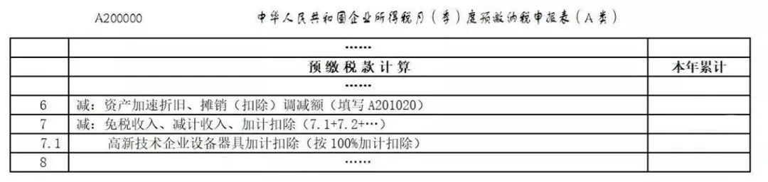 第二步,填报加计扣除情况。在《中华人民共和国企业所得税月(季)度预缴纳税申报表(A类)》(A200000)第7行“减:免税收入、减计收入、加计扣除”下的明细行次中,填写“高新技术企业设备、器具加计扣除(按100%加计扣除)”事项及加计扣除金额。表单节选部分填报如下: