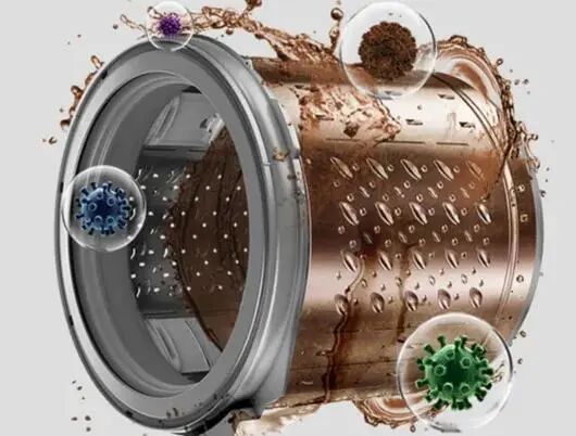 先看一下结构,目前市售的洗衣机产品最常见的是滚筒式、波轮式两种类型,这两种洗衣机都是由可以旋转的内筒与基本固定不动的外筒组成。洗衣过程中,水流经透水孔涌入内桶,在内外桶间不断冲刷拍打衣物,从而达到清洗目的。随着使用时间越来越长,洗衣机内外桶之间容易沉积污渍,并夹杂衣物的织物纤维物质紧密覆盖在内槽中。套筒结构中沉积物长时间堆积残留,导致容易滋生细菌,经透水孔回流到内筒污染衣物。