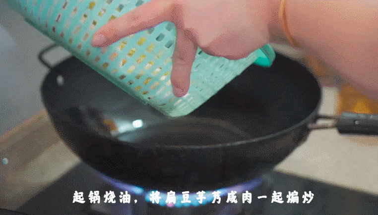 5. 起锅烧油,将扁豆、芋艿、咸肉/鲜肉下锅煸炒