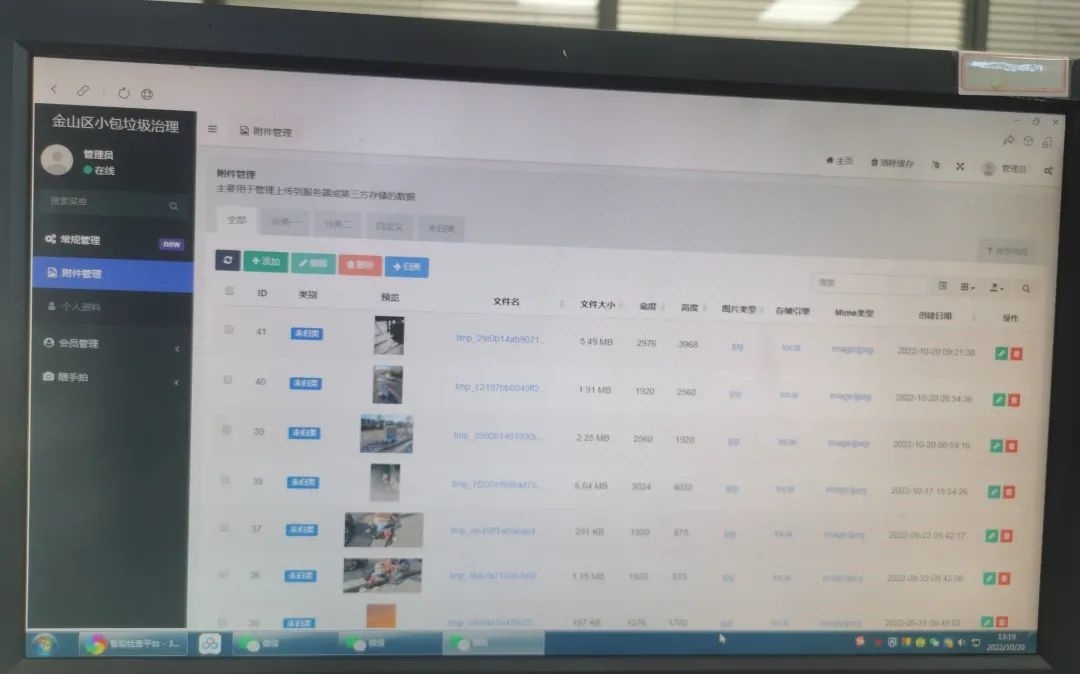 在金山区绿化市容局分减联办,工作人员正在电脑上查看金山区小包垃圾治理管理平台,一张张由市民上传的小包垃圾的照片一目了然,还能看到垃圾位置、上传时间等信息。其中,最新的一张小包垃圾照片来自光明府,工作人员立刻联系山阳镇城建中心进行处理。