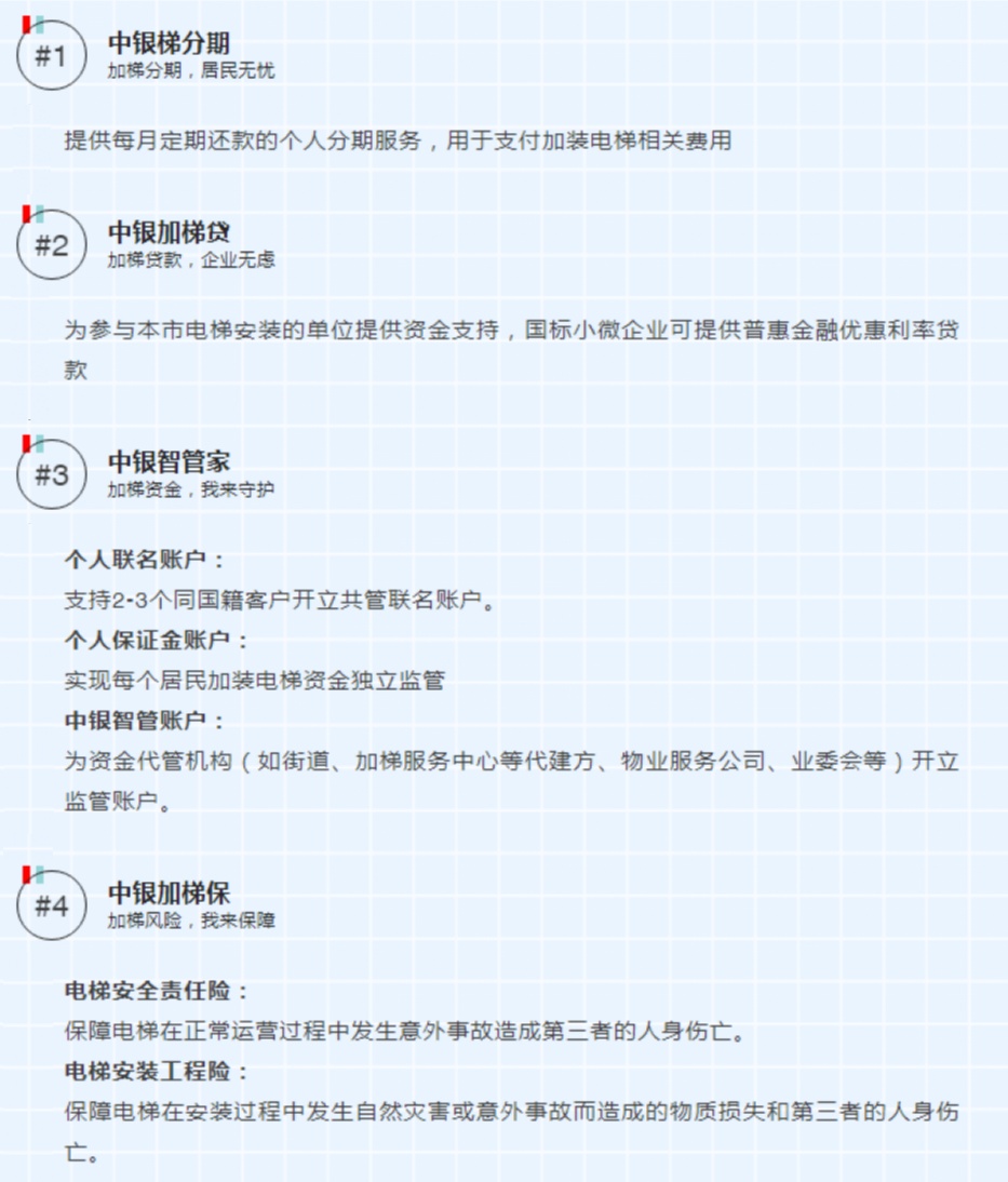 大型国有银行推出全生命金融管家服务。在区相关职能部门的大力支持和指导下,大型国有银行积极提供全生命周期金融管家服务,把银行优质惠民的金融资源带进了社区。其中,中国银行闵行支行作为闵行区政府重要战略合作伙伴,将政府民心工作视为己任,推出了“中银安梯宝”系列产品。同时,可为加梯参建方、小区居民提供低成本融资利率,为每个部电梯楼栋免费赠送三年的电梯安全责任保险。全力打造覆盖加梯前、中、后的全流程服务体系产品,助力民心工程推进落地,探索实践走出了一条新路。