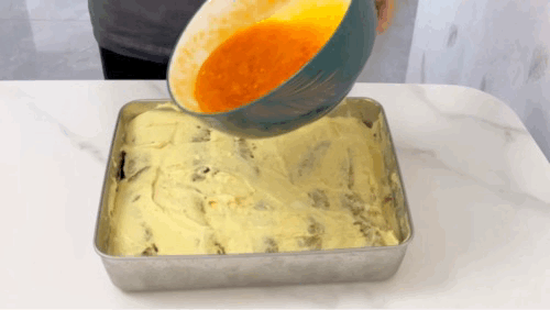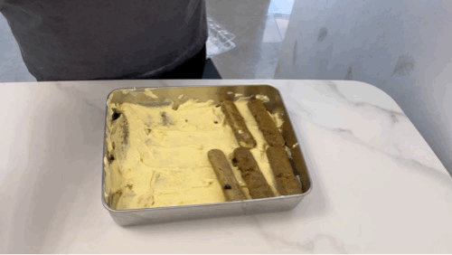步骤5:在手指饼干上覆盖一层提拉米苏蛋糕糊,再重复以上步骤摆放手指饼千和蛋糕糊,摆好后放入冰箱冷藏2小时。