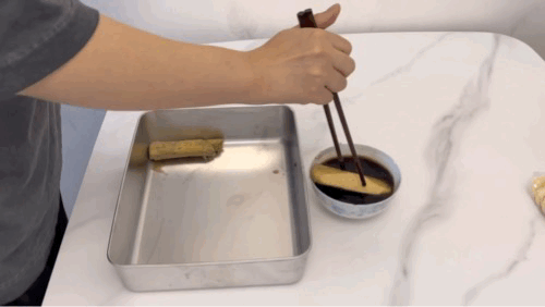 步骤4:手指饼干沾咖啡液后摆入模具中。