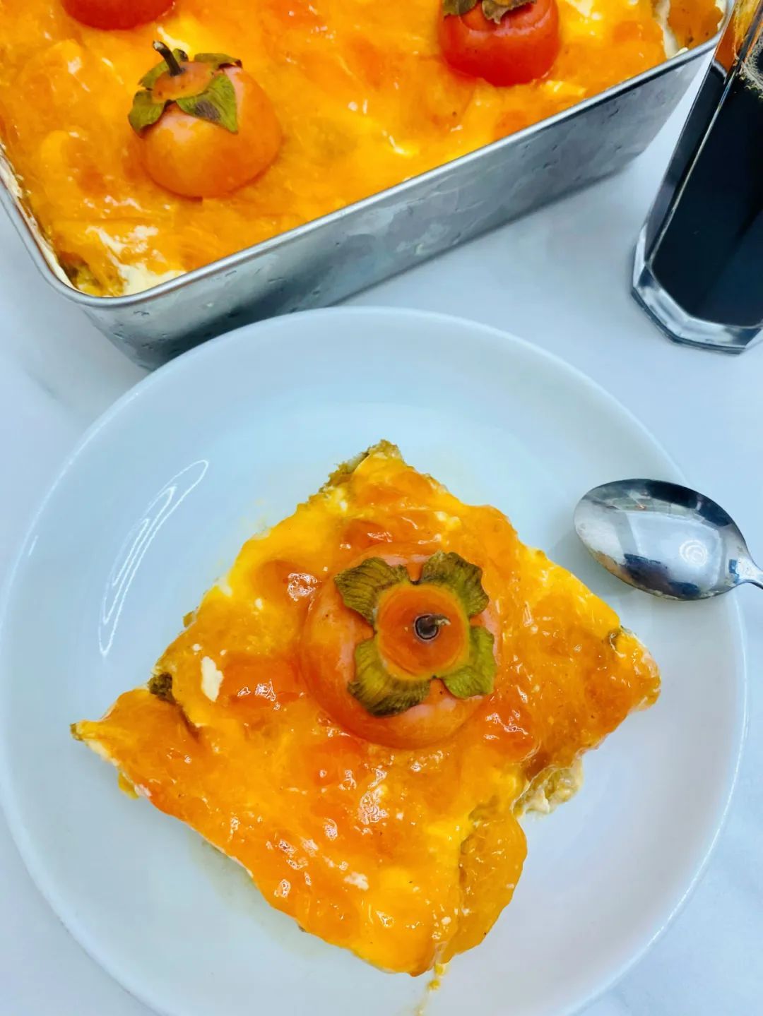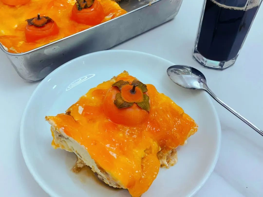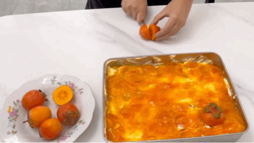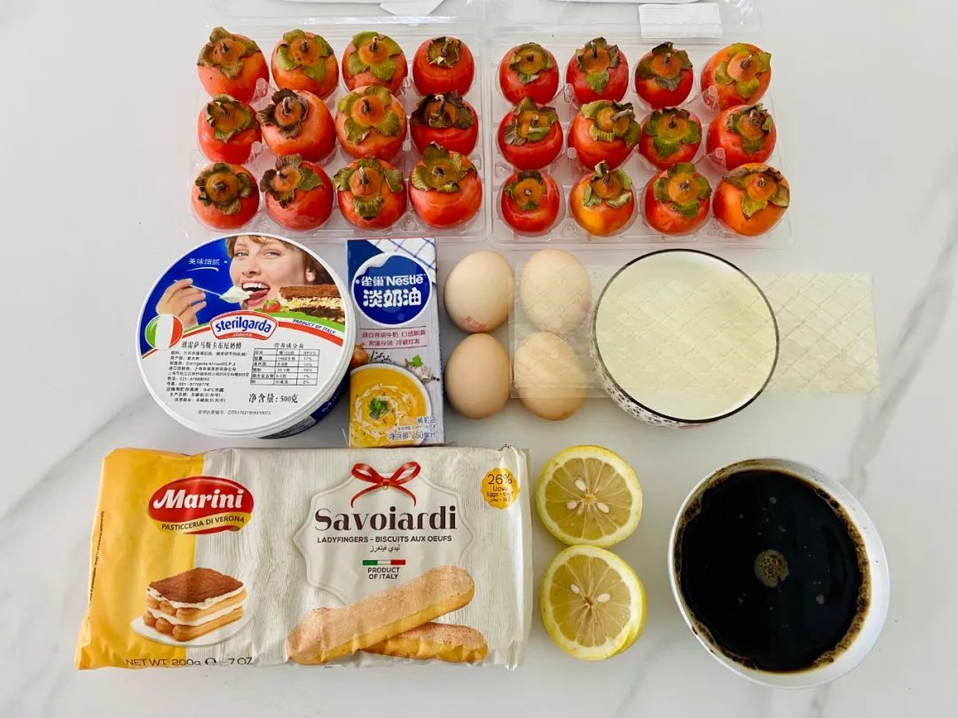 步骤7:6颗柿子洗净后切除下半部分果肉,摆放在提拉米苏表面,就大功告成啦!