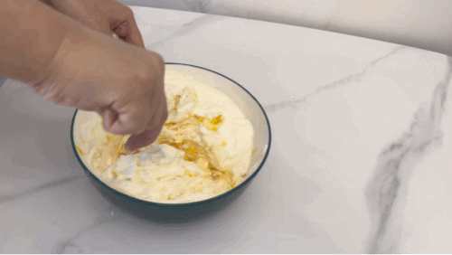 步骤3:马斯卡彭奶酪室温软化后搅拌至顺滑状态,和淡奶油、蛋黄糊一起搅拌均匀。