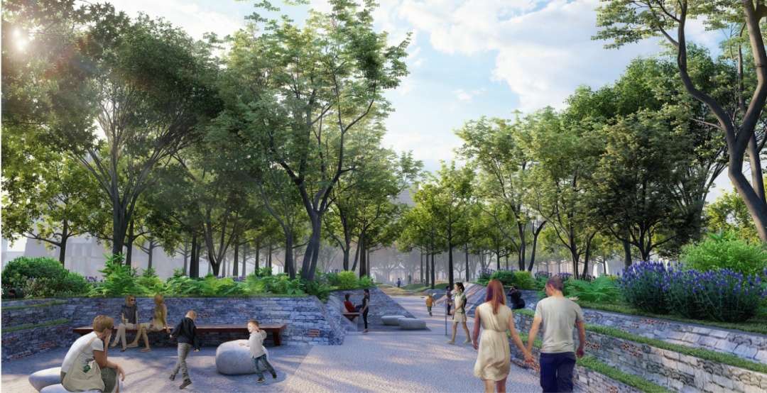 结合蜿蜒的河道和丰富的地形,布置樱花林慢跑道、多功能草坪、滑板胜地和AR动感地形跑道等全龄化运动设施,形成最具人气和活力的运动潮流地。
