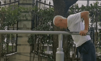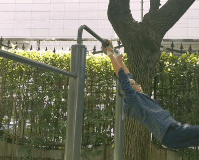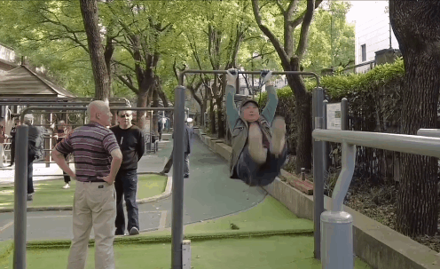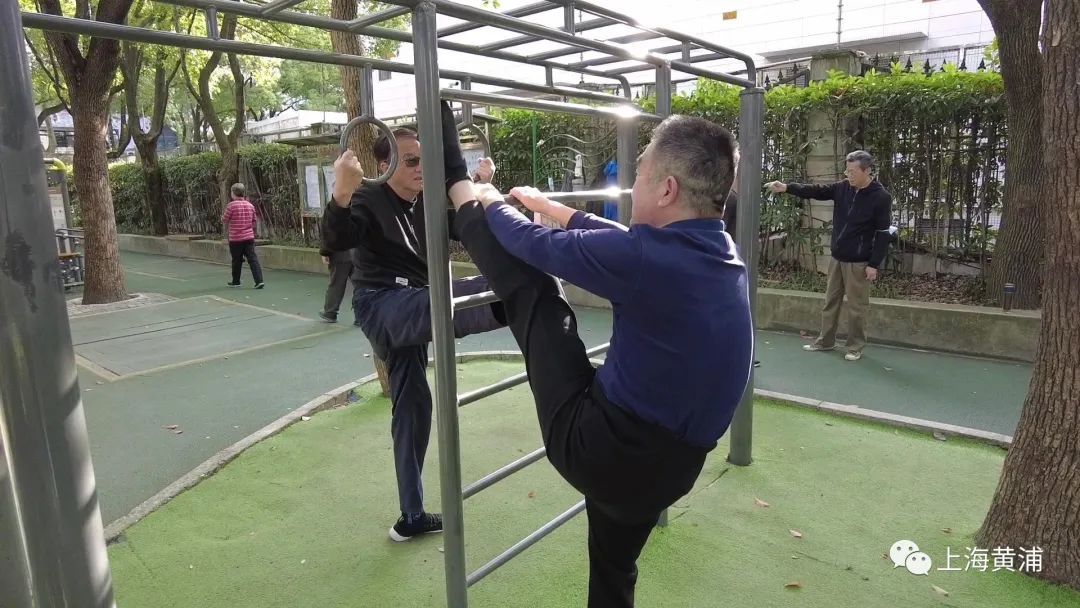 还有更猛的,七八十岁的老人,戴好保护手腕,跳上单杠,就来回大幅度摇摆起来,几圈下来,不断地喘着粗气。