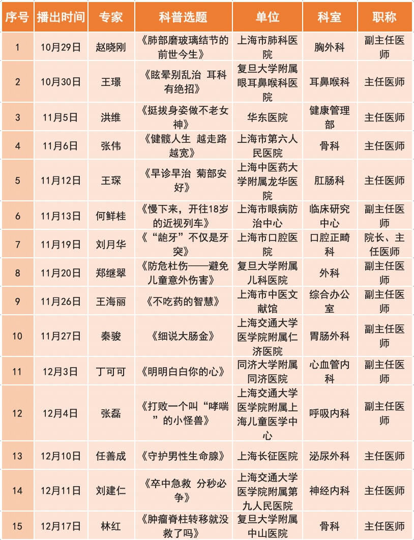 为贯彻健康中国行动、健康上海行动要求和国家卫生健康委等九部门《关于健康科普知识发布和传播机制的指导意见》,切实发挥医疗机构和医务人员健康科普主阵地和主力军作用,增加健康科普服务的高质量供给,不断提升市民健康获得感,助力健康上海行动和常态化疫情防控,市卫生健康委、市健康促进委员会办公室、市健康促进中心、上海教育电视台、海上名医等联合推出“沪卫健康说”科普系列节目,于10月29日起,在上海教育电视台重磅播出,并在“海上名医”在线直播。