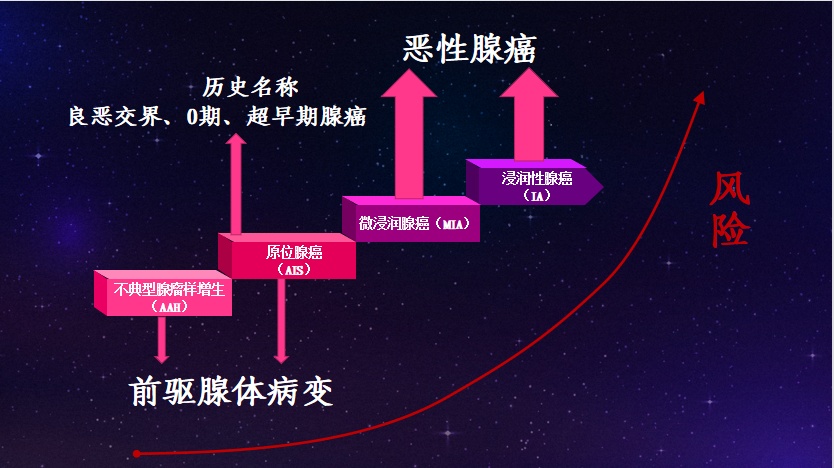 肺部磨玻璃结节肿瘤性病变可分为四个病理阶段:不典型腺瘤样增生、原位腺癌、微小浸润腺癌和浸润腺癌。前两者可以列为良性阶段,后两个被列为恶性阶段。这四个阶段被认为是危险程度逐渐升高、连续性、渐进式的生长过程,且彼此相邻阶段有时候很难区分。肿瘤性的磨玻璃结节多数属于惰性肿瘤,生长缓慢,转移概率低。