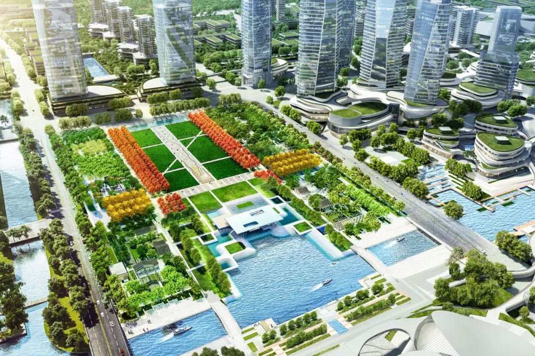 通过开放共享的带状滨水绿地,未来前湾公园串联虹桥国际文化艺术中心、虹桥国际会议中心、虹桥国际城市文化展示馆等重大公共文体设施,勾勒出城景交融的前湾长卷,呈现海派都市的盛世图景。