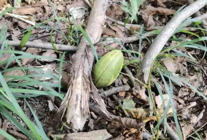 这颗绿色的果实,就是我们过年时常吃的美国山核桃。这果子是植物园分类区内灰胡桃(原产美国)的果实。