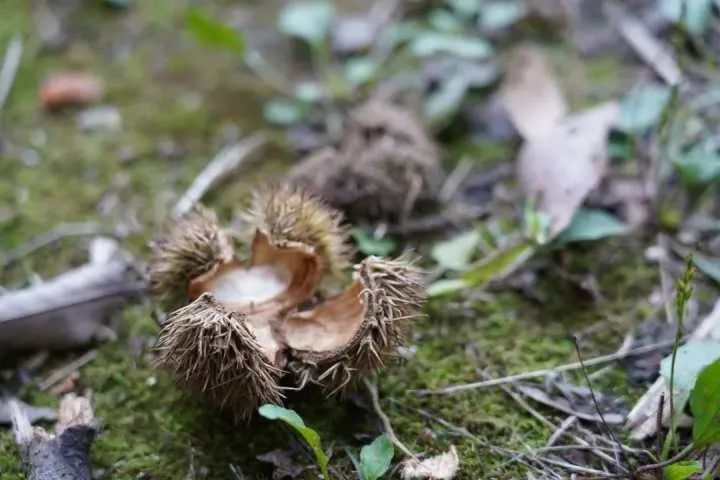 这是栗子树的果子,我们常吃的板栗就被包裹在这多刺的壳斗内,当果实成熟时壳斗裂开而散出。