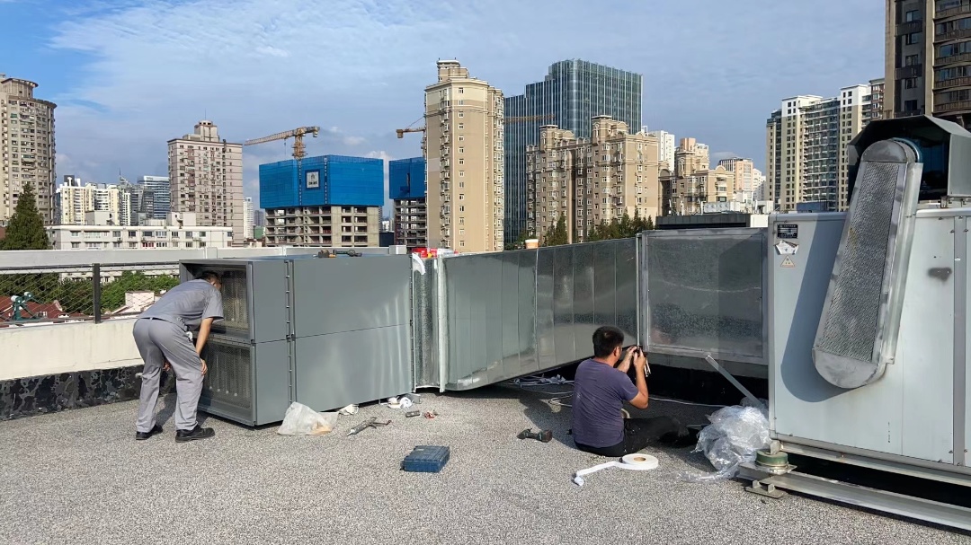 第二天,执法人员在园区物业单位陪同下再次上门,在非营业时间打开厨房吊顶,爬上楼顶平台,仔细查看了每家含油烟餐饮单位安装的设备。结合前一日的视频,执法人员判断是由于排风管道过长,而总管油烟净化设备功率不足,导致峰时厨房油烟废气处理效果不佳。